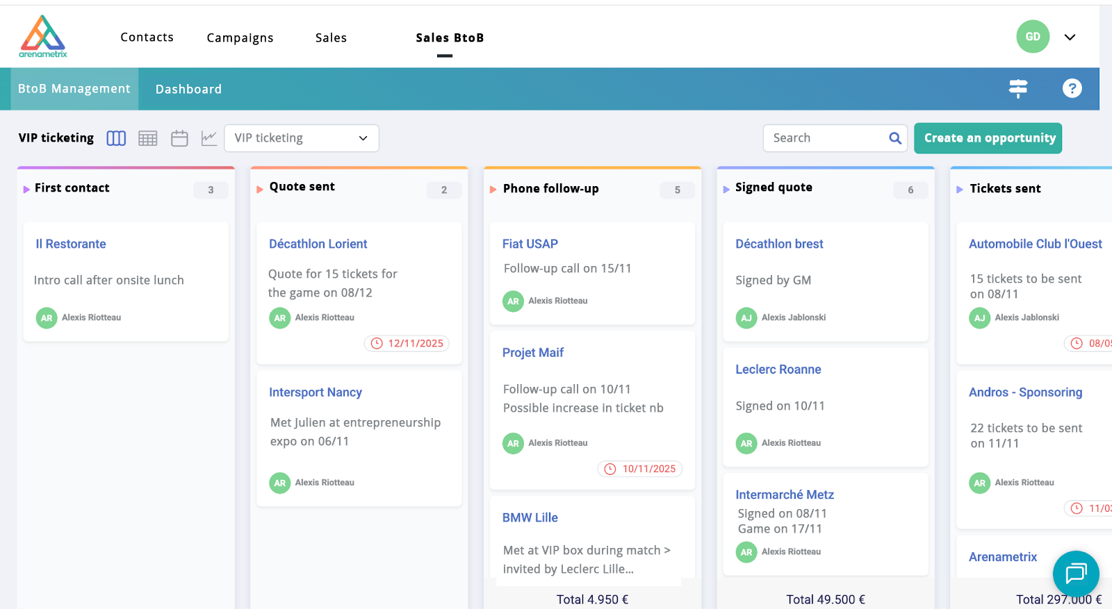 The first step toward efficient B2B prospection is bringing all commercial information together in one place. In many clubs, this knowledge is scattered between teams (sales representatives, hospitality managers, executives,etc). A B2B CRM removes that fragmentation by consolidating every interaction—companies, contacts, and opportunities—into a single shared workspace.