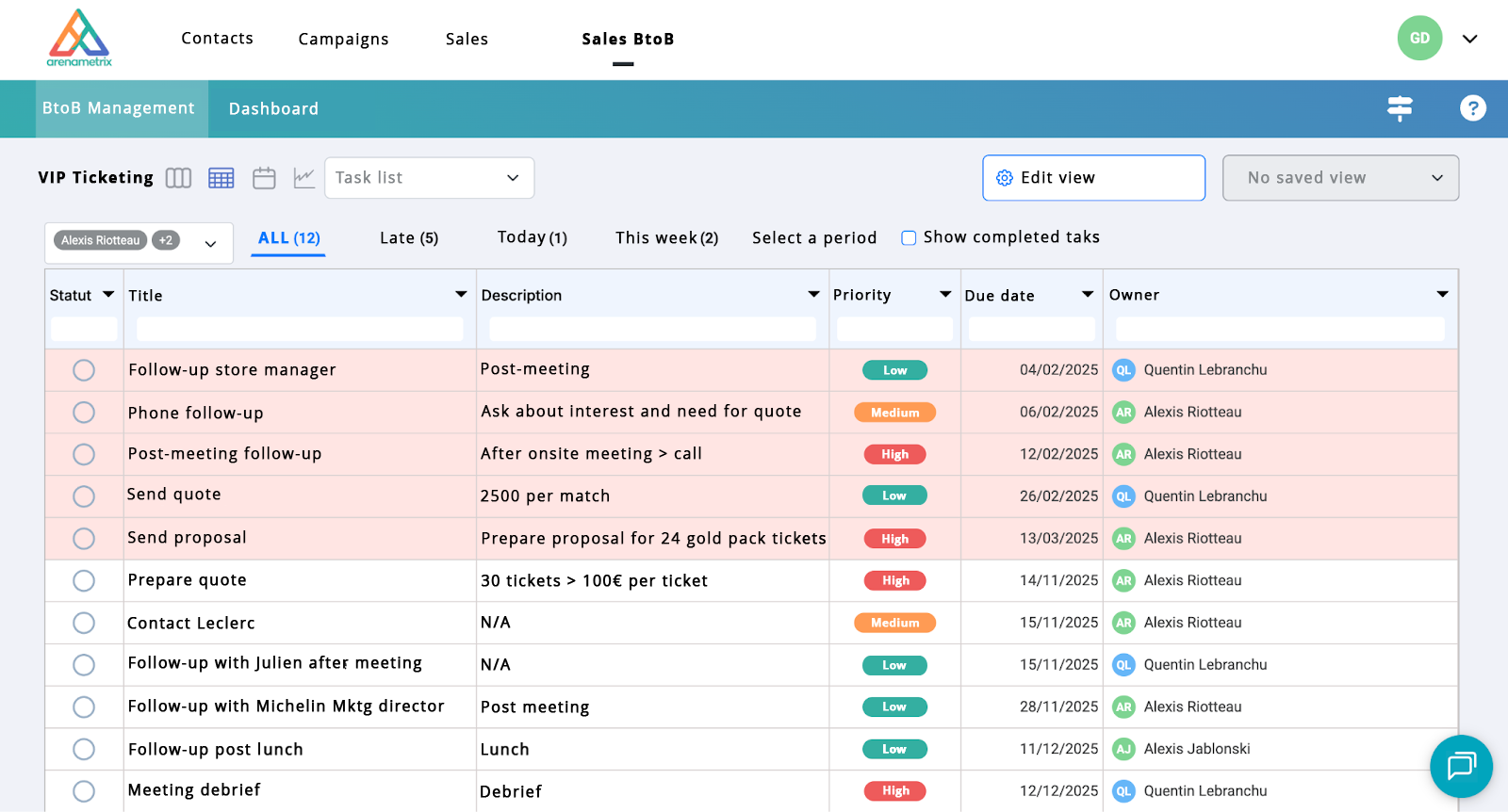 View of the task module in Arenametrix: each sales representative can view their follow-ups