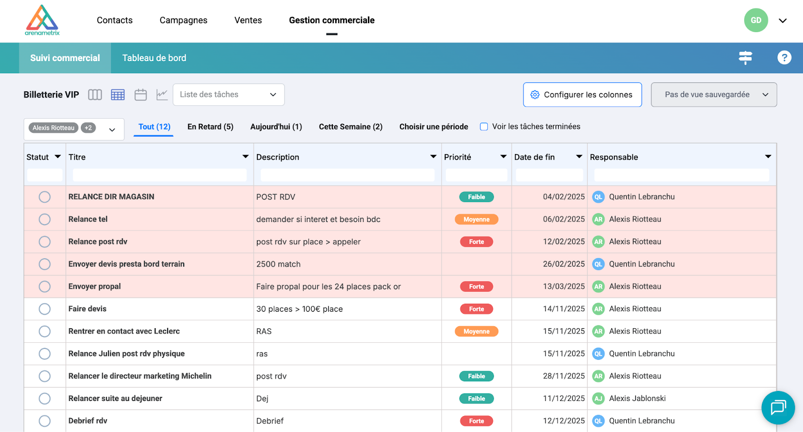 Vue du module de tâches dans Arenametrix : chaque commercial visualise ses relances et priorités, avec la possibilité d’avoir une vue d’équipe (cliquer pour zoomer).